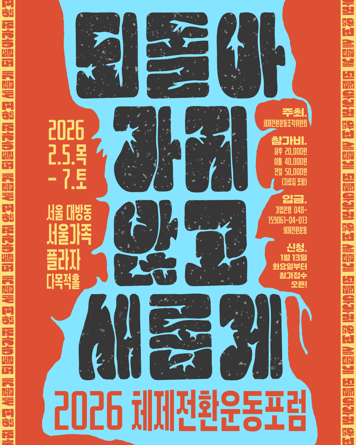 한국사회와 자본주의 체제의 위기를 톺아보고 존엄과 평등이 살아 숨쉬는 새로운 민주주의의 전망을 함께 그려내기 위한 〈2026 체제전환운동 포럼〉이 열린다.