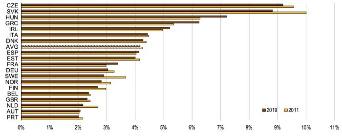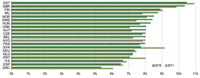 새로 개발된 경험적 접근법을 기반으로 한 그림 1은 2011년부터 2019년까지 유럽 국가들의 친환경 일자리와 고오염 일자리의 예상 점유율을 보여준다. 주요 하이라이트는 다음과 같다.
