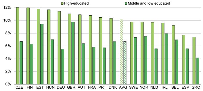 교육 수준이 높은 노동자는 교육 수준이 중간 이하인 노동자에 비해 친환경 일자리에 종사할 가능성이 더 높다(그림 2, 패널 B). 독일에서는 교육 수준이 높은 노동자의 11%가 친환경 일자리에 종사하고 있으며, 이는 교육 수준이 낮거나 중간 수준인 노동자의 비율(6%)의 거의 두 배에 달하는 수치다. 이러한 패턴은 친환경 직종이 평균적으로 비친환경 직종에 비해 고숙련, 덜 일상 집약적이며 기술과 관련된 고도의 분석 및 기술력이 필요하다는 미국의 연구 결과와 일치한다(Vona et al. 2018).