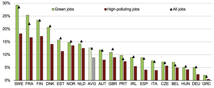 모든 국가에서 여성이 친환경 일자리에 종사할 확률이 낮다(그림 2, 패널 A). 예를 들어, 영국에서는 남성 노동자의 15%가 녹색 일자리에 고용되어 여성 노동자의 비율(6%)보다 두 배 이상 높다. 이는 대부분 환경적 관점에서 중립적인 서비스업, 보건, 교육 등의 서비스업에서 여성이 과도하게 대표되는 것을 반영한다. 반면 남성은 제조업, 건설업, 공공서비스업(친환경 일자리와 고오염 일자리 모두에서 가장 높은 비중을 차지하는 산업)에 과대 대표되고 있다.