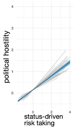 지위 중심의 위험 감수 수준에 따른 온라인 정치적 적대감 수준(설문조사에 참여한 사용자 15,000명)을 보여준다. 밝은 회색 선은 국가별 추정치를 나타내며, 어두운 선은 전체 평균 연관성을 나타낸다. 출처: 보르(Bail), 마리(Marie), 프라델라(Pradella), 피터슨(Petersen), 푸르니(Fourni) 저자 제공