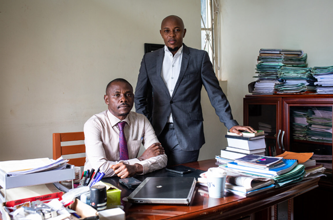 피터 아라나인웨(Peter Aranaintwe, 왼쪽)와 앤서니 오두르(Anthony Odur)는 우간다의 인권 변호사들로, 동아프리카 원유 파이프라인(East African Crude Oil Pipeline)으로 인해 안전, 토지, 생계가 위협받는 의뢰인들을 대변하고 있다. 출처: 키부카 무키사/CliDef