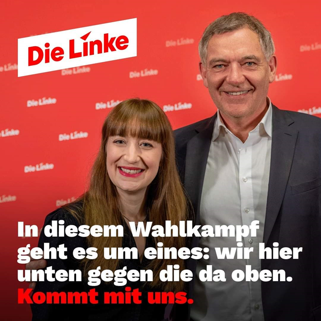 좌파당의 새로운 당 대표로 선출된 이네스 슈베르트너(Ines Schwerdtner)와 얀 반 아켄(Jan van Aken). 출처: 공식 페이스북