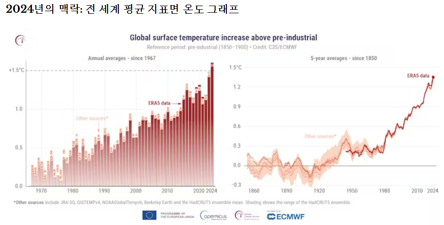 2024년은 산업화 이전 수준보다 1.5°C를 초과하는 첫 해였지만, 5년 평균은 여전히 이 기준치보다 낮다. 코페르니쿠스 글로벌 기후 하이라이트 보고서 2024