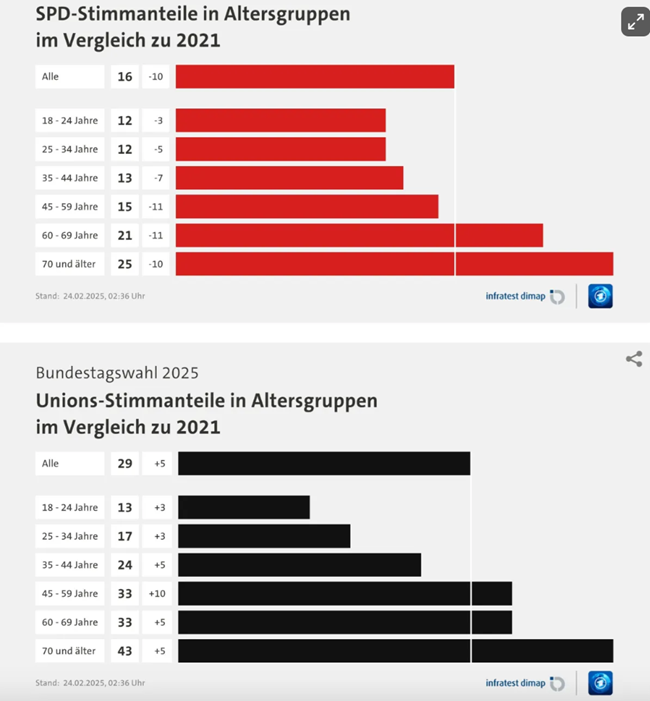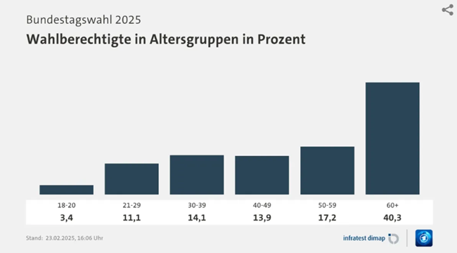 지역 외에 이번 독일 선거에서 가장 중요한 분열선은 연령대일 가능성이 크다. 독일 전체 유권자의 40%가 60세 이상이며, 57%가 50세 이상이다. 반면 30세 미만 유권자는 단 14.5%에 불과하다. 새롭게 선거권을 얻은 유권자는 전체의 3.4%에 지나지 않는다.