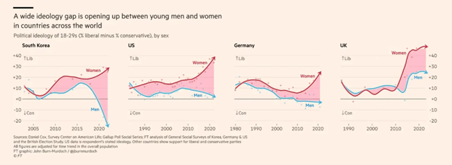 그리고 성별 차이도 있다. 존 번머독(John Burn-Murdoch)은 전 세계적인 성별 분극화에 대한 뛰어난 그래픽을 업데이트했다.