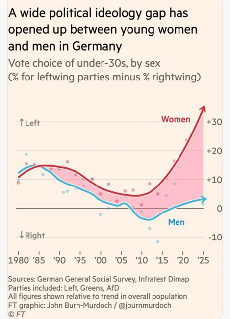 최신 독일 선거 데이터가 반영된 결과를 보면, 젊은 독일 남성들은 약간 다시 중도로 이동하는 경향을 보이는 반면, 젊은 독일 여성들은 계속해서 강하게 좌파로 이동하고 있으며, 그 격차는 이제 30포인트에 달한다. 존 번머독이 나와의 개인적 대화에서 확인해 준 바에 따르면, 이 격차는 무엇보다도 좌파당의 약진에 의해 주도되고 있다.