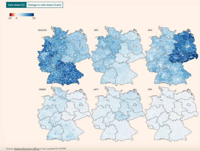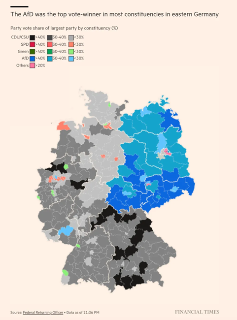 따라서 독일의 정치 지형이 분열되고 있다고 말하는 것은 정확하지 않다. 동독 지역에서는 AfD가 선두 정당으로서의 입지를 공고히 다지고 있다.
