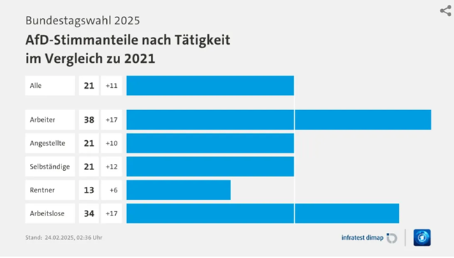 AfD는 자신을 ‘노동자’(Arbeiter)로 규정하는 유권자들 사이에서 압도적인 선두를 차지하고 있다. ‘사무직 노동자’(Angestellte)층에서도 상당히 높은 지지를 받고 있으며, ‘자영업자’(Selbstständige) 사이에서도 강세를 보인다. 반면, 예상과 달리 ‘퇴직자’(Renter)층에서는 저조한 성적을 기록했으며, ‘실업자(Arbeitslose)층에서는 압도적인 지지를 받고 있다.