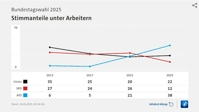 독일 TV 분석가들이 어제 가볍게 언급했듯이, ’노동자‘ 계층은 이제 전체 유권자의 단 10%에 불과하다는 점을 상기할 필요가 있다. 이들은 너무나도 주변화되어 관련 데이터 표의 제목조차 차지하지 못하고 있다.