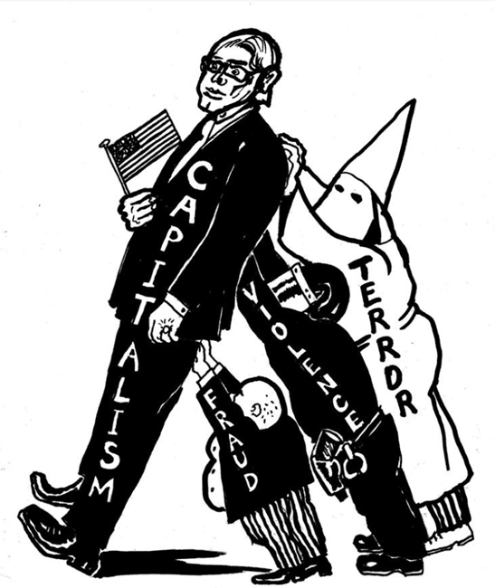 이후의 페이지에서는 "파시스트를 만드는 과정"이라는 제목의 이중화(diptych, 두 개의 대칭적 작품)가 등장한다. 한쪽에는 "자본(Capital)"이 "파시즘(Fascism)"이라는 죽음의 아버지(death-daddy) 형상을 떠받치고 있으며, 그 옆에는 "사기(Fraud)", "폭력(Violence)", "공포(Terror)"라고 적힌 인물들이 배치되어 있다.