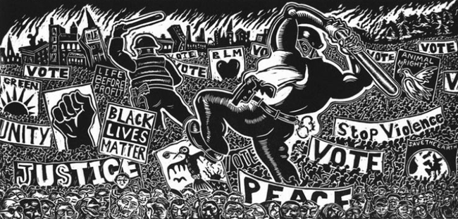 그의 그림 속에는 "아이들을 보호하라, 총이 아니라(Protect Children Not Guns)"라는 문구가 적힌 피켓을 든 시위대가 있다. "파시즘과 싸우라(Fight Fascism)"라는 깃발 아래에서 맞잡은 흑인과 백인의 손이 있다. "공감(Empathy)"이라는 제목의 사라져가는 모래시계 주위에 함께 모여 있는 아이들과 동물들이 있다. "민주주의(Democracy)"라는 이름이 붙은 여성 형상이 "희망(hope)"의 새를 날려 보내는 모습도 있다.