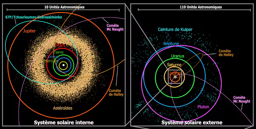 소행성대는 화성과 목성 사이에 위치하며, 카이퍼대는 해왕성 너머에 펼쳐져 있다. 출처: Pline/Wikipedia, CC BY
