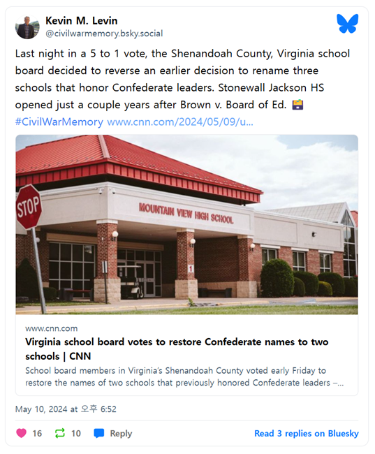 어젯밤 5대 1의 표결로, 버지니아주 셰넌도어 카운티의 교육위원회는 남부연합 지도자들의 이름을 따서 명명된 세 학교의 명칭을 변경하기로 한 이전 결정을 뒤집기로 했다. 스톤월 잭슨 고등학교(Stonewall Jackson HS)는 브라운 대 교육위원회 판결(Brown v. Board of Ed.) 이후 불과 몇 년 뒤에 개교했다.