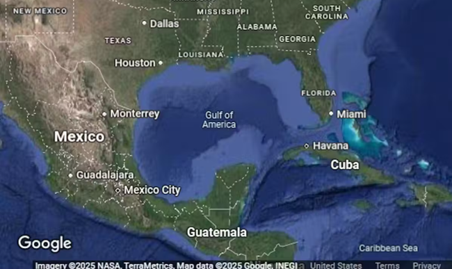 2025년 3월, Google 지도는 '멕시코만(Gulf of Mexico)' 대신 '아메리카만(Gulf of America)'이라는 명칭을 표시했다. 출처: Google, INEGI