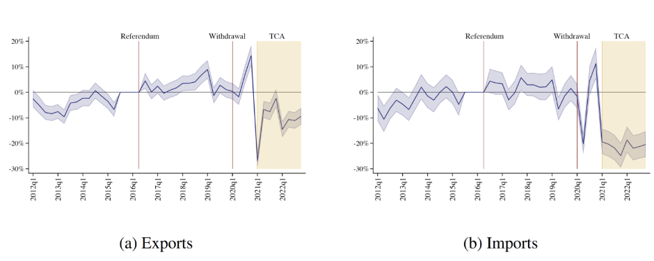 분석 결과, 2021년 TCA 발효 이전에는 EU와의 무역이 세계의 다른 지역과 비교해 유의미하게 감소했다는 증거를 찾지 못했다. 이 결과는 국민투표 이후 무역 장벽이 높아질 것이라는 불확실성과 그에 대한 예상이, 실제로는 EU와의 상대적 무역을 줄이지 않았다는 것을 의미한다. 미래의 무역 비용 증가에 대한 불확실성에 직면한 기업들은, 이미 수출입을 위해 고정비용을 지불한 상태이기 때문에, 불확실성이 해소될 때까지 해외 구매자나 공급자와의 관계를 변경하지 않고 기다리는 쪽을 선택했을 가능성이 있다.