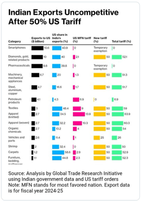 <블룸버그>의 메나카 도시(Menaka Doshi)가 제안했듯이, 이는 “‘어프렌티스’(The Apprentice, 2004년부터 미국 NBC에서 방영된 리얼리티 TV 프로그램)의 한 장면 같지만 새로운 캐치프레이즈가 있다. ‘너, 관세 먹었어!(You’re tariffed!)’ 이 실제 에피소드에서 인도의 나렌드라 모디 총리는 도널드 트럼프 미국 대통령의 환심을 다시 사기 위해 21일의 시간을 부여받았다. 실패한다면, 관세가 두 배인 50퍼센트로 오르면서 인도 수출은 사실상 세계 최대 소비시장으로부터 봉쇄될 것이다.”