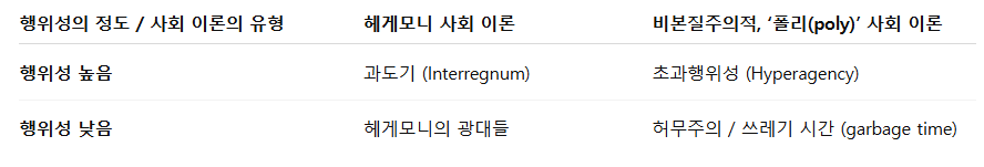 과도기(Interregnum): 기존 질서가 붕괴하고 새로운 질서가 아직 등장하지 않은 과도기 /초과행위성(Hyperagency): 통제 불가능한 과도한 행위성, 모든 것이 특정 행위자에게 집중되는 상태/허무주의, 쓰레기 시간(garbage time): 의미 없는 시간, 질서나 구조가 무너진 상태(스포츠에서 유래된 용어)