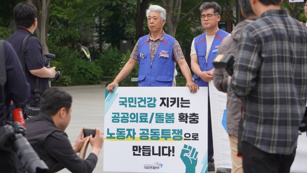 지난 5월 12일, 의료연대본부 주최 ‘새 대통령은 공공의료 공공돌봄으로 국민건강 지켜라’ 기자회견에서 피켓을 들고 있는 모습. 의료연대본부 제공