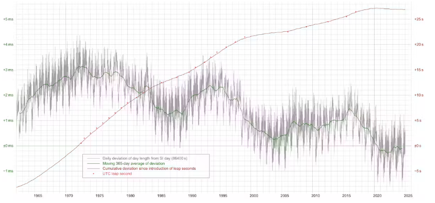24시간(86,400초) 기준에서 하루 길이의 역사적 편차. 출처: Ⅱ Ⅶ Ⅻ / 국제 지구자전 및 기준계 서비스(International Earth Rotation and Reference Systems Service)제공.