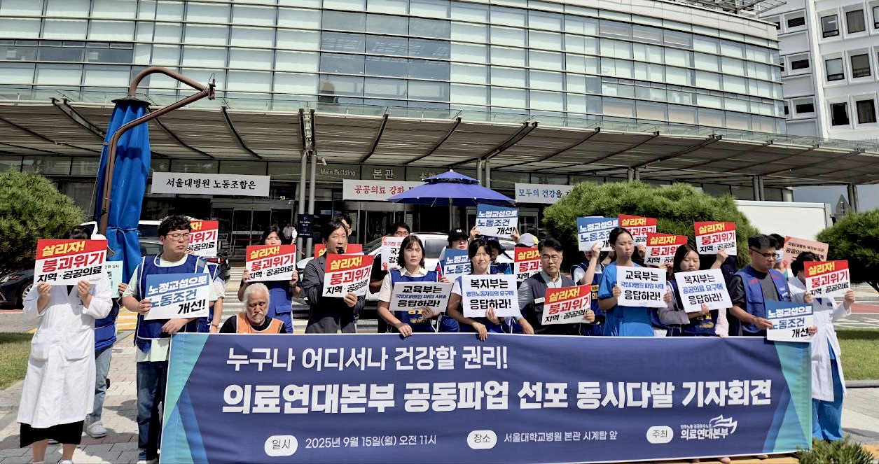 이날 박경득 의료연대본부장은 서울대병원 시계탑 앞에서 열린 서울 지역 기자회견에 참여해, “이재명 정부는 국립대병원을 육성해 지역의료 격차를 해소하고 공공의료를 강화하겠다”고 밝힌 바 있다면서 “그런데 정부의 계획을 집행해야 할 바로 그 국립대병원 노동자들이 정부에 맞서 파업에 나선 이유는, 정부가 말한 국정과제를 정말로 달성하고 싶어서”라고 역설했다. 박 본부장은 정부의 “국정과제 어디에도 지역완결의료를 만들 수 있는 계획이 없고, 지역의료 총괄체계 구축 방안도, 무너지고 있는 공공병원을 살릴 예산도, 병원이 없는 지역에 공공병원을 설립할 계획도, 건강보험 보장성 강화 목표도 없다”며, 때문에 “의료연대본부는 정부의 계획이 사기에 가깝다고 판단한다”고 이야기했다.