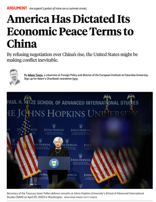 반면 중국 문제에서는 바이든 팀이 선을 그었다기술 제재를 강화했고중국을 봉쇄하기 위한 글로벌 동맹 체계를 구축했다경제와 관련해서는 좁은 마당높은 울타리라는 구호가 그들의 사고의 정점이었다이는 강대국 경쟁과 경제 발전 사이의 긴장을 해소하기 위해노골적인 경쟁의 금지 구역과 우호적 경쟁의 구역을 구분하는 것이었다그러나 긴장을 완화하기는커녕이 슬로건은 미국이 무엇이 허용 가능한 발전이고 무엇이 아닌지를 정의하겠다는 주장을 분명히 했을 뿐이다그리고 결정적으로바로 재닛 옐런 재무장관이 속내를 드러냈다그는 투키디데스 함정이나 전쟁 위협은 걱정할 필요가 없다고 언급했다단지 중국이 자기 궤도 안에 머무르며 미국의 힘에 도전하지 않는 성장 경로에만 머문다면 괜찮다는 것이었다이는 미국이 평화의 조건을 독단적으로 규정하고 있음을 드러내는 발언이었다.