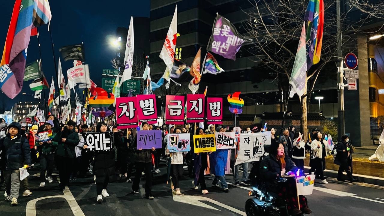 윤석열 퇴진 행진에서 참가자들이 ‘차별금지법’ 피켓을 들고 행진하고 있다. 차별금지법제정연대 제공