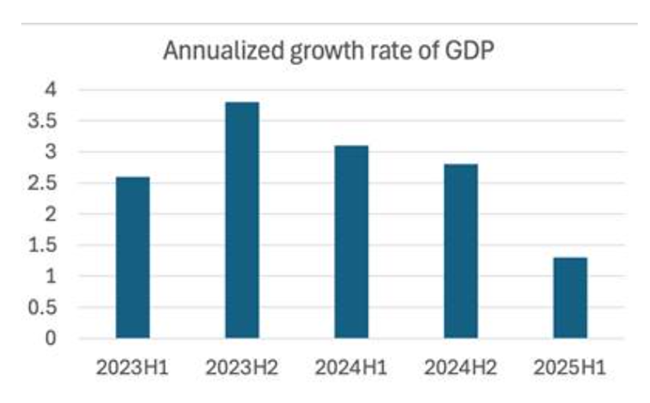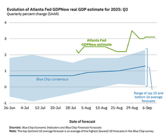 뉴욕 연방준비은행도 자체 예측 모델을 갖고 있다뉴욕 연준 스태프 나우캐스트(New York Fed Staff Nowcast)는 2025년 3분기 성장률을 현재 2.1%로 전망하고 있다역시 이것은 연율 기준 수치이며분기별 증가율이나 전년 동기 대비율과는 다르다그러나 지금까지 어떤 지표나 모델을 보더라도미국 경제는 올해 6월에서 9월 사이 여전히 확장세를 이어간 것으로 예상되며다만 그 속도는 둔화되고 있다.