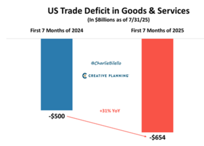 트럼프 행정부 관리들은 관세가 인플레이션에 아무런 영향을 주지 않고 있다고 주장한다그러나 그것이 사실이라면결국 공급 충격으로 인한 물가 상승이 애초에 발생하고 있었다는 뜻이 된다실제로 지금까지 관세의 영향은 제한적이었다그 이유는 트럼프가 관세 소동을 벌이자마자 미국 수입업자들이 재고를 최대한 늘리고 관세 인상 전에 앞당겨 물건을 들여왔기 때문이다그래서 2025년 상반기에 미국의 수입이 급증했고무역적자가 급격히 악화했다.