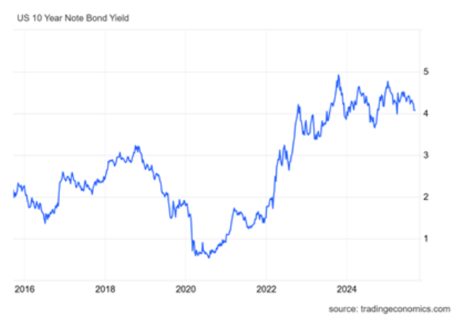 관세 수입으로는 현재 GDP 대비 5.5%를 넘는 연방정부의 연간 재정적자를 줄일 수 없다(다소 둔화되고 있더라도). 실제로 전망에 따르면 향후 10년 동안 연간 재정적자는 GDP 대비 5.9%까지 증가하고공공부채의 GDP 대비 비율은 125%에 이를 것으로 보인다증가하는 공공부채 비율은 국채 투자자들에게 또 다른 우려 요인이며따라서 연방준비제도가 단기 금리를 인하하더라도 국채 수익률을 끌어올릴 것이다.