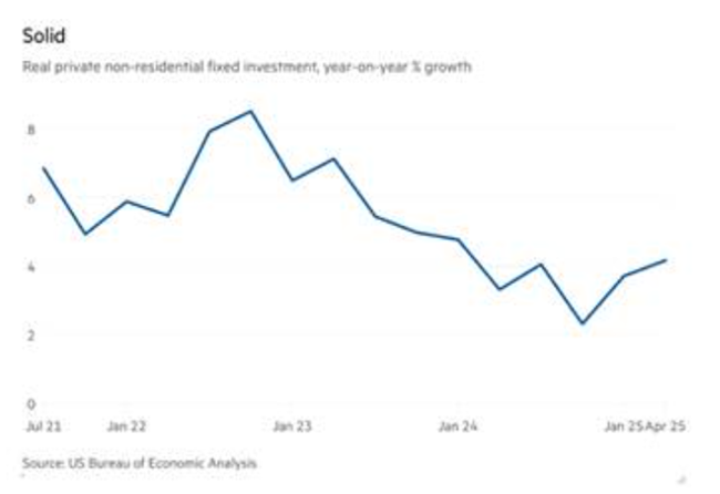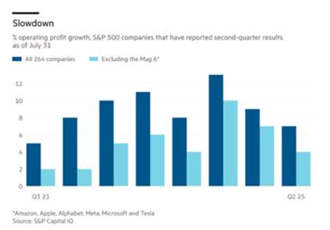 기업 이윤은 여전히 증가하고 있다. S&P 500 기업(금융 부문 제외)의 영업이익은 직전 분기 기준으로 전년 대비 9% 증가했다그러나 이 수치에는 이른바 매그니피선트 세븐(Magnificent Seven)’ 하이테크 기업들의 막대한 이익이 포함돼 있다이들을 제외하면나머지 비금융·비에너지 기업들의 이익 증가율은 약 4~5% 수준에 불과하며 둔화하고 있다이러한 기업들의 이윤 성장은 생산비 상승에 의해 압박받고 있다여기에 수입 관세가 부품과 원자재 가격을 끌어올리면서 그 압박은 더욱 심화할 것이다.