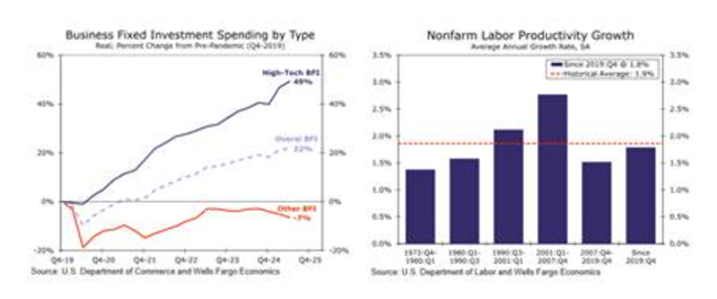 그러나 이러한 기업 투자 증가의 상당 부분은 고도 기술 분야즉 인공지능 붐을 뒷받침하기 위한 데이터 센터와 기타 인프라에 집중되어 있다. 2019년 이후 이 부문의 기업 투자는 거의 50% 늘어난 반면미국 기업의 다른 부문 투자는 7% 감소했다첨단 기술과 인공지능 투자 덕분에 노동 생산성 성장률이 약간 끌어올려지기는 했지만여전히 1990년대와 2000년대 수준에는 못 미친다만약 인공지능 투자 붐이 꺾인다면기업 투자는 급격히 추락할 것이다.