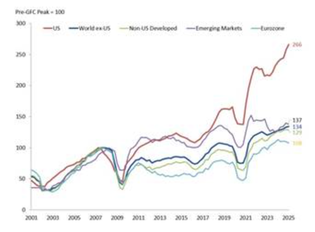 이익 측면에서 보면미국 기업은 다른 어느 곳보다 훨씬 더 좋은 성과를 냈다글로벌 금융 위기 이전의 정점을 기준으로 미국 기업의 이익은 166% 급증했으며이는 다른 지역을 훨씬 앞지른 것이다이에 비해 유로존은 거의 움직임이 없어서 기업 이익이 고작 8% 증가하는 데 그쳤다.