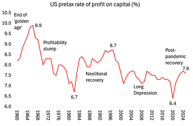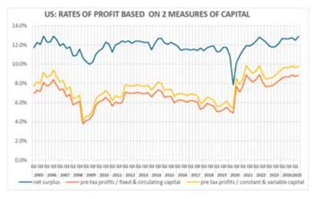 그리고 2020년 팬데믹 침체가 끝난 이후 미국 자본의 수익성이 개선됐다브라이언 그린(Brian Green)의 계산에 따르면미국 기업의 자본에 대한 세전 이윤율은 2006년보다 높은 수준에 있다.