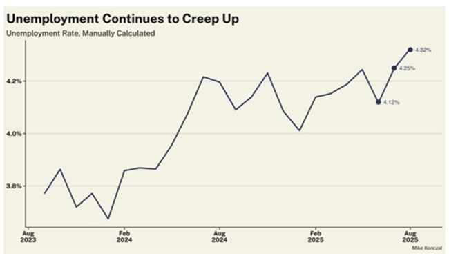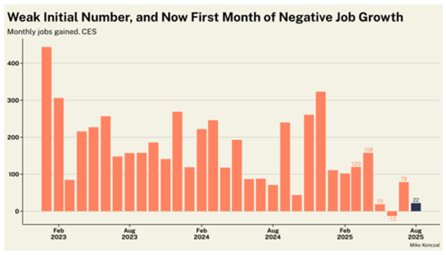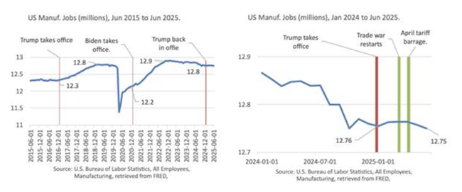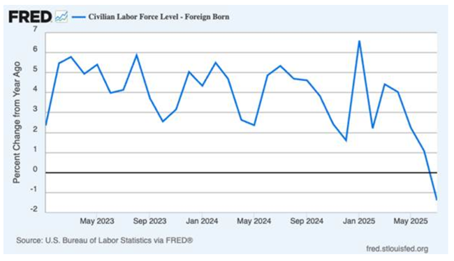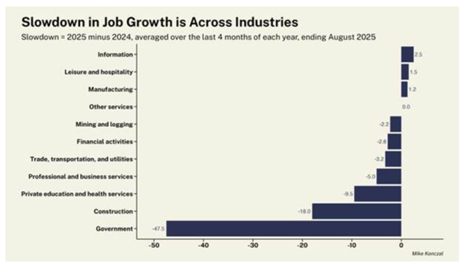 트럼프는 노동통계국(BLS)이 매우 약한 고용 증가 수치를 기록하자 국장을 해임했다그러나 그 이후 연간 고용 수치의 수정 결과, 2025년 3월까지 1년간 고용 증가가 91만 1천 명 줄어든 것으로 나타났다전달자를 해임한다고 해서 메시지가 바뀌는 것은 아니다미국의 일자리 증가는 경기 침체 시기를 제외하면 60년 넘게 볼 수 없었던 수준까지 둔화됐다고용 증가가 둔화된 이유는 수요가 약해서가 아니라이민이 줄고 제조업이 여전히 불황에 머물며정부 기관과 노동력이 트럼프에 의해 초토화되면서 공급 증가가 마른 탓이다.