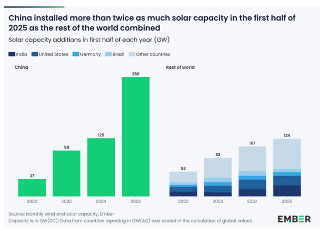 2025년 상반기 중국의 신규 설치량은 올해 전 세계 다른 모든 나라가 설치한 신규 용량의 두 배 이상이었다. 2위인 인도는 24GW를 설치했고, 3위인 미국은 21GW를 설치했다. 이는 규모에서 한 자릿수(즉, 10배) 차이가 난다.