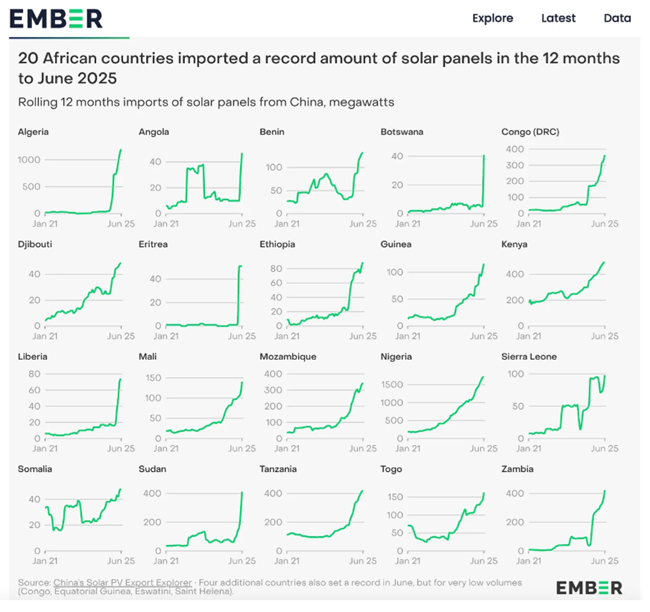 전기화와 빈곤의 다른 한 끝에서는, 아프리카로의 중국산 태양광 패널 수출이 급증하고 있다는 극히 고무적인 소식이 있다.