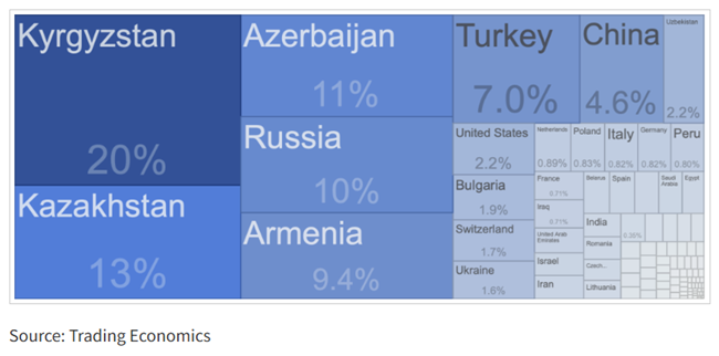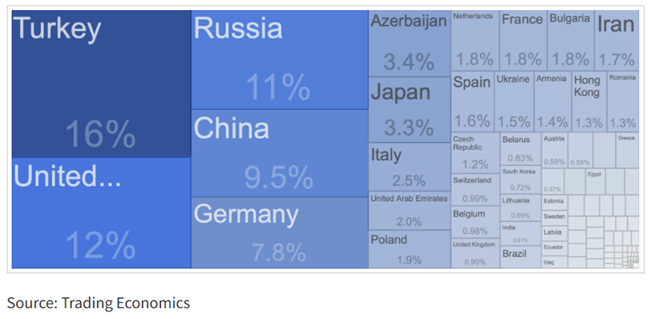조지아의 러시아중국 및 지역 파트너들과의 교역 규모는 EU와 미국과의 경제 관계를 훨씬 능가한다다음은 국가별 수입 현황이다.