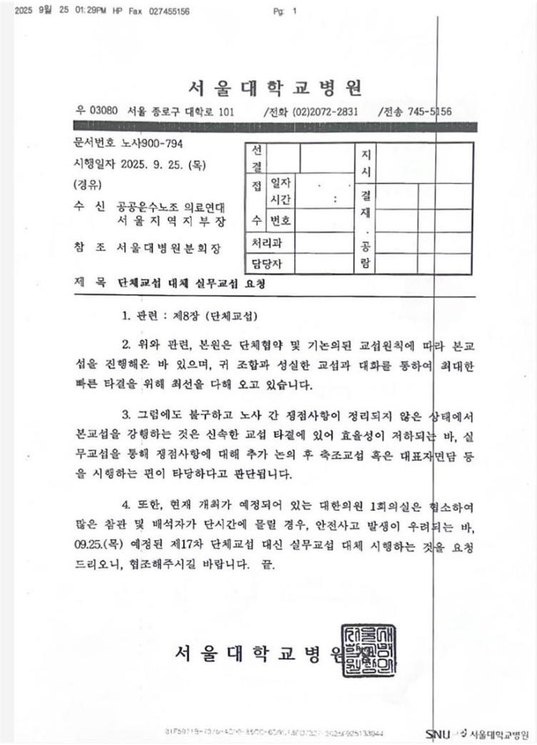 서울대병원 측이 25일 오후 3시로 예정된 본교섭을 1시간여 앞두고 보내온 본교섭 거부 통보 공문. 의료연대본부 제공