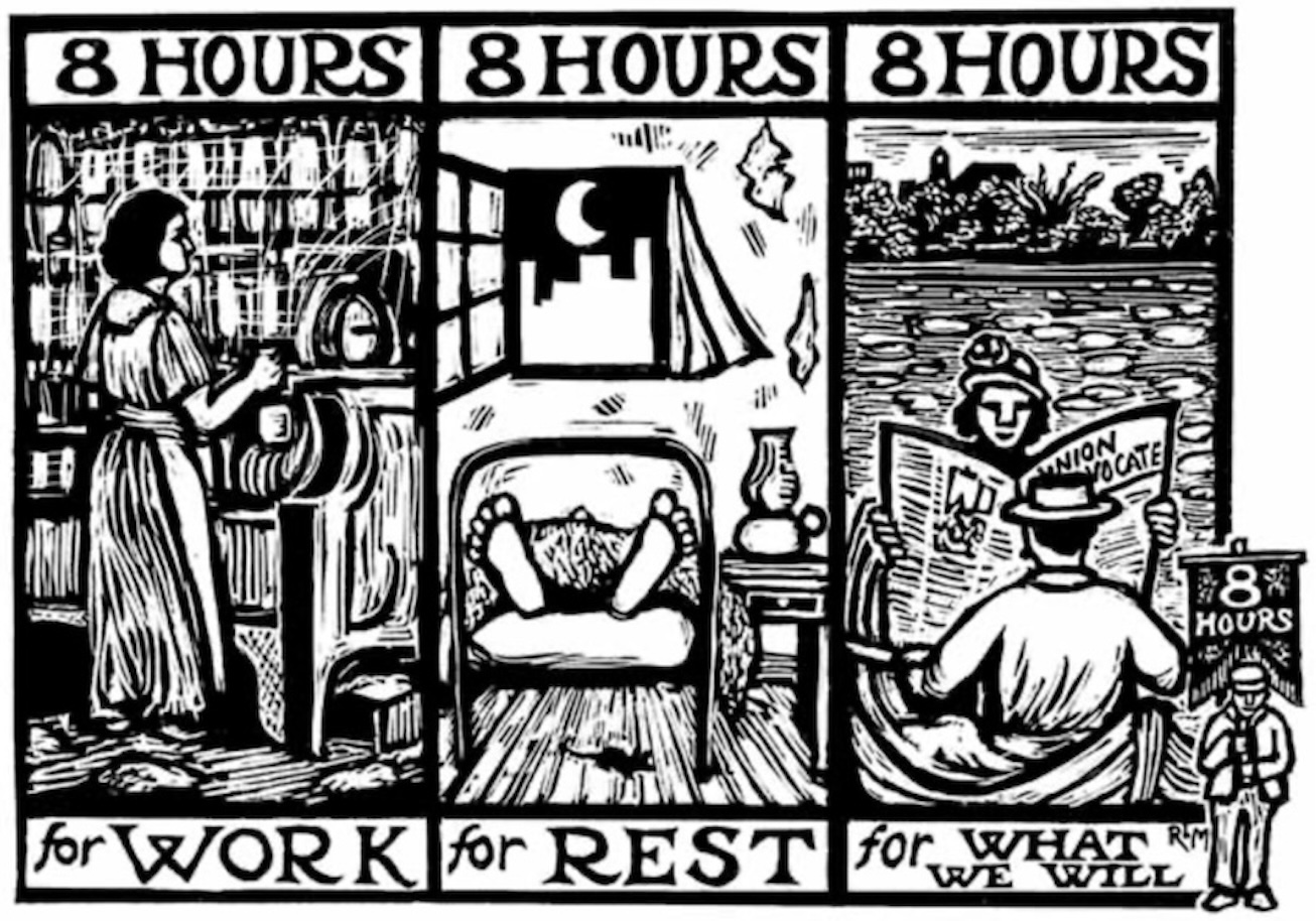 8시간 노동, 8시간 휴식, 8시간 교육으로 인간다운 삶을 요구했던 미국 노동자 민중들의 투쟁을 기억하는 판화. Ricardo Levins Morales