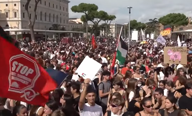 팔레스타인 해방을 요구하는 총파업, 이탈리아 토리노. 출처: 현지 방송 화면 갈무리