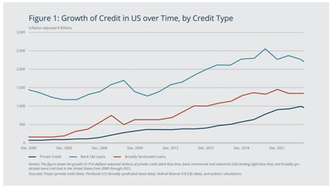 이것이 상업은행들이 직면한 위험이다. 그러나 점점 더 많은 대형은행들이 기업, 특히 중소기업에 직접 대출하기보다는 이른바 ‘비은행 대출업체‘에 유동성을 제공하는 쪽으로 움직이고 있다. 현재 비은행 금융기관들은 전체 미국 은행대출의 10% 이상을 차지한다. 은행의 직접적인 대차대조표 내 자금 공급은 2012년 이후 급격히 줄었지만, 비은행에 대한 신용공여는 크게 늘어나 현재 GDP의 약 3%에 해당한다. 비은행 대출은 2020년 5천억 달러에서 현재 거의 1조 3천억 달러로 증가했으며, 이제 기업 자금조달의 점점 더 중요한 원천이 되고 있다.