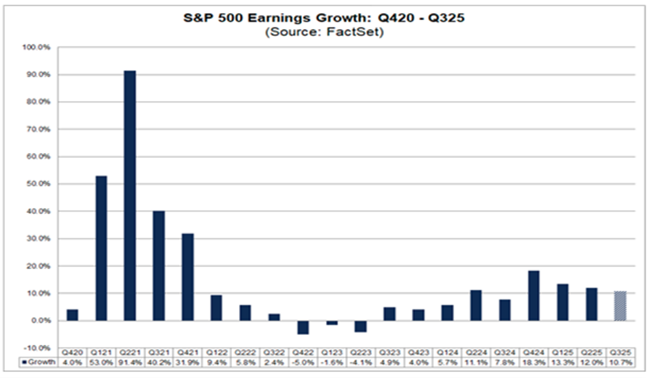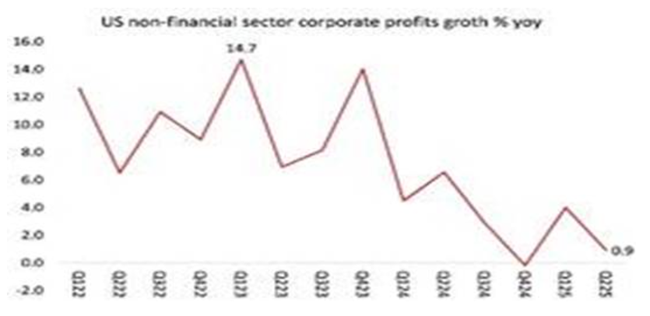 이전 글들에서 나는 미국의 ‘성공 신화’가 거의 전적으로 기술 대기업들의 AI 투자 확대 덕분이라고 지적했다. 이들 기업은 여전히 막대한 이익을 쌓아가고 있다. 그러나 나머지 미국 기업 부문은 침체 상태에 있다. 기업 부문 전체적으로는 여전히 이익이 증가하고 있지만, 그 속도는 둔화되고 있다. 2024년 말에는 전년 대비 18% 이상 상승했지만, 2025년 3분기에는 10.7% 상승으로 둔화됐다. 여전히 양호한 수치이지만, 하락 추세에 접어들고 있다.