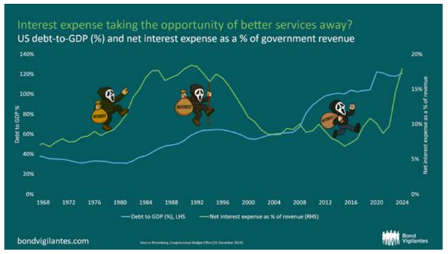 하지만 투자자들과 기업 전략가들에 따르면, 경제 카드 묶음에서 유일한 ‘조커’는 공공 부문이다. 미국 정부는 여전히 막대한 연간 예산 적자를 기록하고 있으며, 그 결과 정부 부채 수준을 끌어올리고 있다. 따라서 그 부채를 상환하는 비용 또한 증가하고 있다.