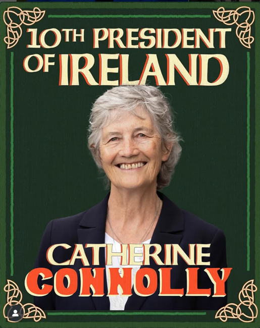 아일랜드의 새 대통령 캐서린 코놀리(Catherine Connolly)는 팔레스타인 인권을 옹호하고 유럽의 군사화 추진에 반대하는 공개적인 좌파 정치인이다. 그의 압도적인 승리는 보수 정치 기득권층에 거대한 충격을 안겼다.
