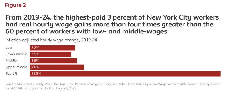 뉴욕시정문제연구소(Center for New York City Affairs)의 제임스 A. 패럿(James A. Parrott)이 작성한 도시 개발 비교 데이터는 뉴욕시가 2019년부터 2024년 사이 실질 중위 가계소득이 뚜렷하게 감소한 미국 내 유일한 도시임을 보여준다.