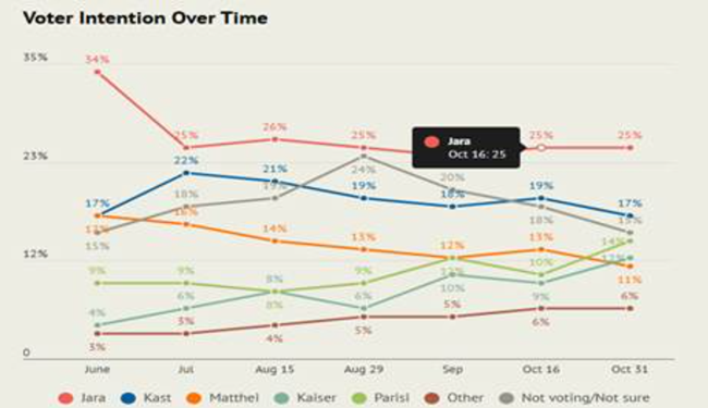 보리치는 2021년 선거에서 결정적인 승리를 거둔 전직 학생운동가였다. 투표가 의무가 아닌 자발적 방식으로 바뀐 이후 최고 수준인 56%의 투표율 속에서 당시 35세였던 보리치는 극우 정치인 호세 안토니오 카스트의 44%에 맞서 56%를 득표했다. 그러나 이번에는 득표 비율이 반대가 될 수도 있다. 보리치의 노동부 장관을 지낸 공산당의 히아네트 하라가 이끄는 좌파 연합이 여론조사에서는 앞서고 있지만, 그는 보리치가 그랬던 것처럼 1차 투표에서 과반을 얻지 못할 것이다. 그리고 여러 우파 정당들이 표를 결집해 12월 2차 결선투표에서 카스트를 대통령 자리에 올릴 가능성이 크다.