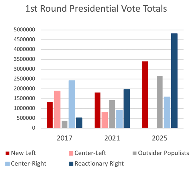 이전 두 차례의 전국 선거와 비교하면, 유권자들이 반진보적으로 이동한 것은 부정할 수 없다. 충격적이게도, 하라는 1차 투표에서 간신히 카스트를 앞섰는데, 득표율은 27% 대 24%였다. 더 나쁜 점은, 전체 유권자의 절반이 세 명의 우파 후보에게 표를 던졌다는 것이다. 카이저와 마테이를 제칠 만큼 예상 밖의 19.7%를 얻은 파리시의 성과에도, 강경 우파는 승리를 주장할 수 있다. 2017년 돌풍을 일으킨 선거에서, 급진 좌파는 무소속으로 출마한 카스트보다 세 배나 많은 표를 얻었고, 중도 연합은 여전히 지배적인 위치를 유지했다. 이후의 선거는 칠레의 2019년 10월 대중 봉기, 즉 에스따이디오(estallido) 이후에 치러졌고, 정당성이 크게 추락한 기존의 대표적 정당 연합들은 재민주화 이후 최저 지지율을 기록했다. 새 좌파는 2021년에 지지층을 넓혔지만, 팬데믹과 경기 침체 속에서 과도하게 진보적인 제헌의회의 활동에 대한 불만이 커지면서 카스트가 1위를 차지하는 데 힘을 실었다. 이번 선거에서는, 카스트와 그의 전 동지였던 카이저로 대표되는 강경 우파가 논쟁의 여지 없는 승자였다. 중도좌파 전체가 득표율을 소폭 늘리는 데 그친 반면, 강경 우파의 득표는 전체 유권자의 4분의 1 조금 넘는 수준에서 3분의 1을 넘는 수준으로 증가했다.