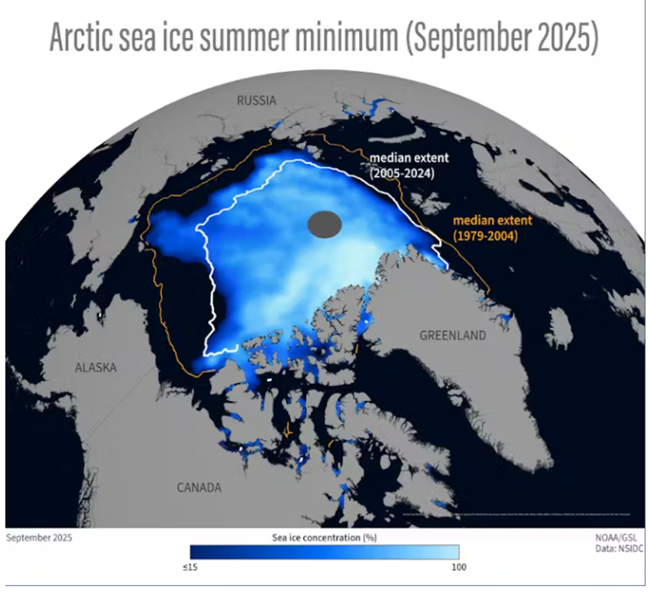 2025년 9월, 여름 말 연간 최소기에 해당하는 북극 해빙 농도는 1979~2004년 중위값보다 훨씬 작았다. 파란색의 농도는 해빙의 밀집 정도를 나타낸다. 출처: 미국 해양대기청과 콜로라도대학교 볼더 캠퍼스 산하 CIRES