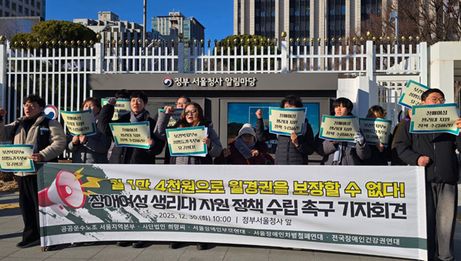 장애 여성의 월경권 보장을 위한 국가 차원의 생리대 지원 정책 수립을 촉구하는 기자회견이 30일 오전 정부서울청사 앞에서 열렸다. 공공운수노조 서울지역본부와 장애인·여성·시민사회단체들은 현행 생리용품 지원 정책이 청소년 중심의 선별 지원에 머물러 있으며, 성인 장애 여성은 제도 밖에 놓여 있다고 지적했다.